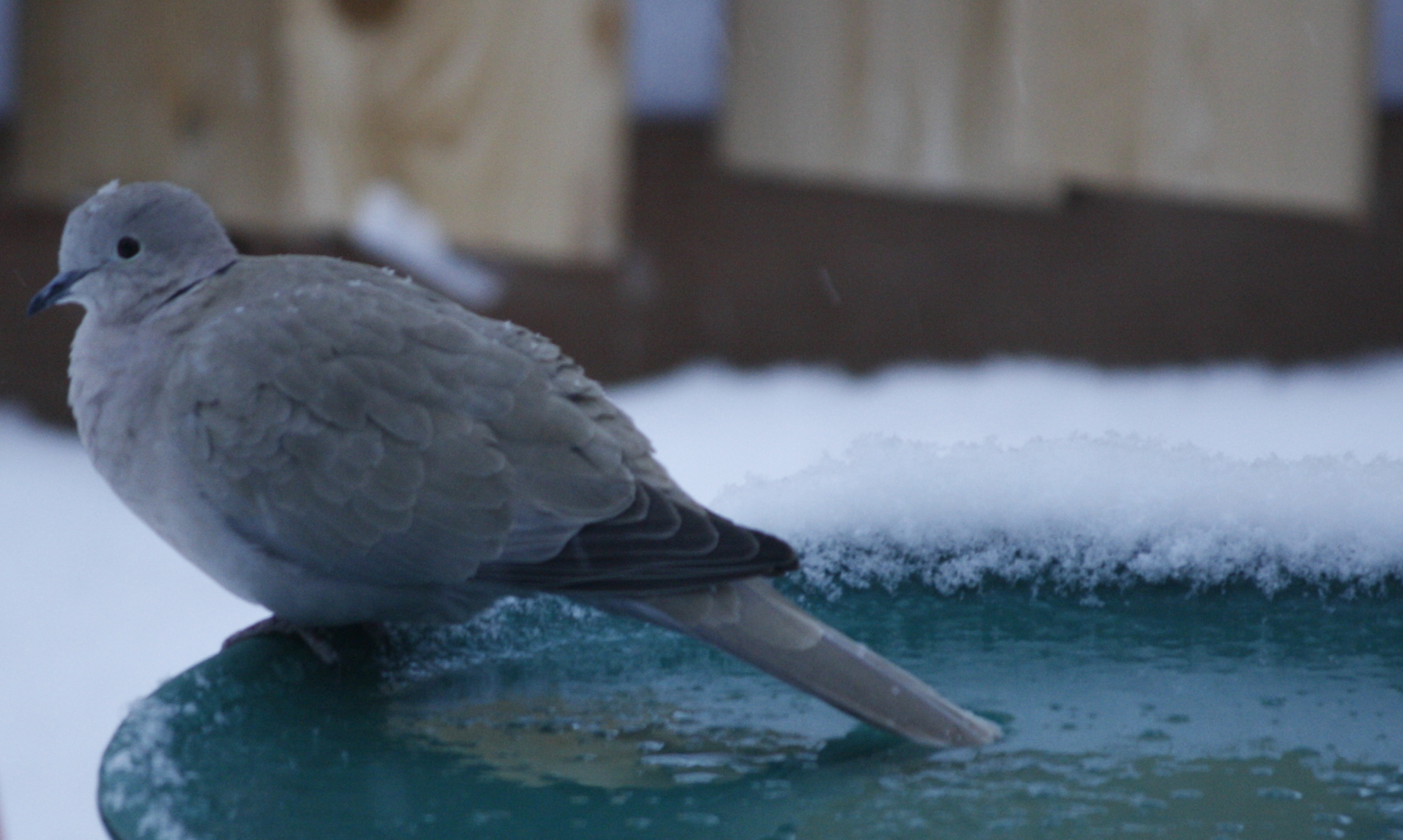 In this case, an Eurasian Collared-Dove dipping its tail in a heated, slushy bird bath.