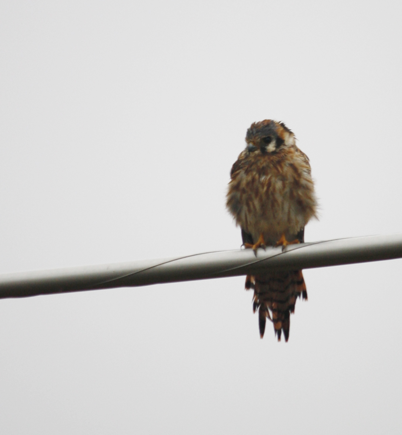 This morning I looked out and saw a member of the typically debonaire American Kestrel species out on the wire. In the rain.