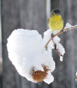 This morning I woke to about 10 inches of snow on the rail. The finches, especially the goldfinches, were very busy in the sunflowers. I brought my camera to the basement and sat next to Marcel at the sliding glass door where he was intently monitoring the birds’ movements. I snapped a total of 124 photos of those active little birds, confident I was getting many good shots. Wrong. Between their near-constant movement, the swaying of the sunflower stalks, and Marcel rubbing himself against me, I ended up with a whole lot of soft images. But I couldn’t delete them all and am including a sample here to document the lovely start to my day.