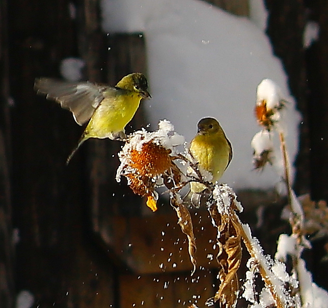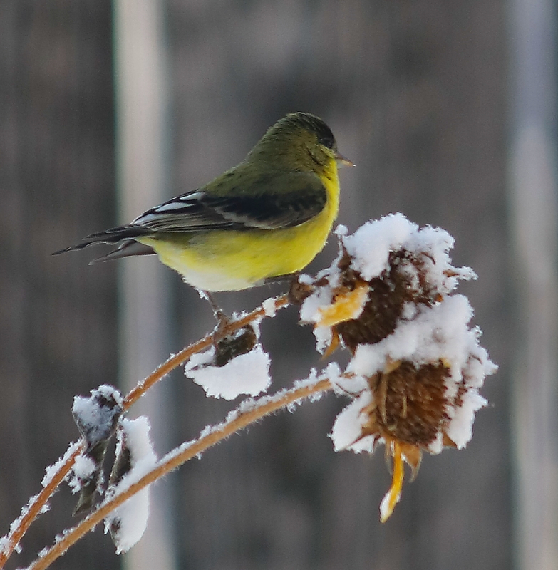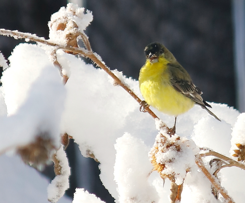 This morning I woke to about 10 inches of snow on the rail. The finches, especially the goldfinches, were very busy in the sunflowers. I brought my camera to the basement and sat next to Marcel at the sliding glass door where he was intently monitoring the birds’ movements. I snapped a total of 124 photos of those active little birds, confident I was getting many good shots. Wrong. Between their near-constant movement, the swaying of the sunflower stalks, and Marcel rubbing himself against me, I ended up with a whole lot of soft images. But I couldn’t delete them all and am including a sample here to document the lovely start to my day.