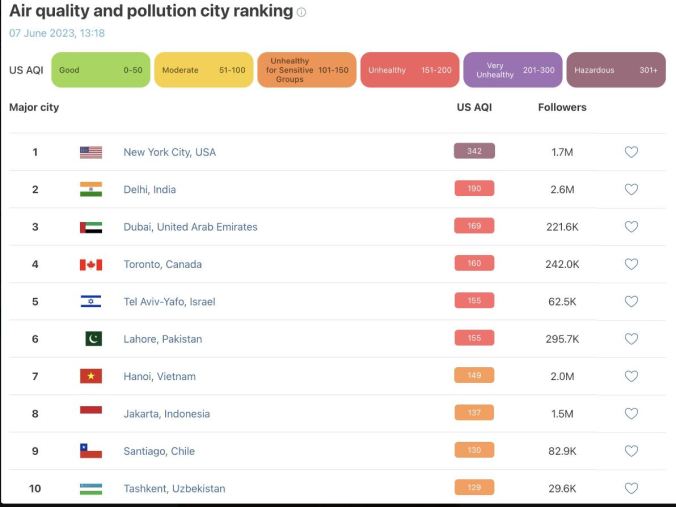 The northeastern portion of the United States is currently experiencing what millions around the world endure on a daily basis as they struggle to breathe polluted air. The smoke from wildfires in Canada are engulfing the northeast and I feel horrible for the people living there (and everyone else around the globe breathing bad air).