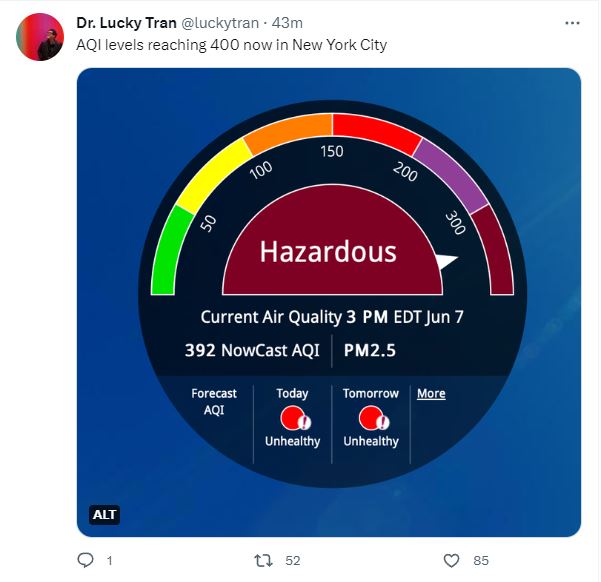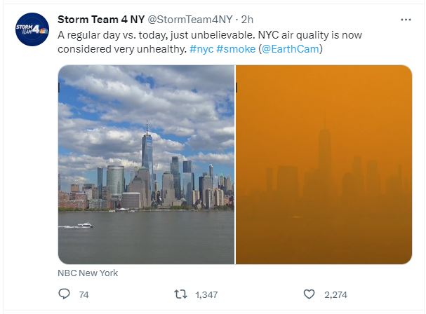 I appreciated the contrast of the photos in the above tweet, but the text is incorrect: NYC is currently experiencing HAZARDOUS air quality (they’ve moved far beyond Unhealthy) as seen in this chart: