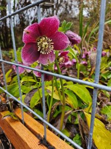 One last thing to share: hellebore plants in the front yard. The photo on the left was taken after today’s walk and the other from a couple weeks ago is the more common representation of these plants which like to hide their faces which mean’s today’s sighting is a gift, and that visibility is due to the fence’s support. All hail the hog wire!