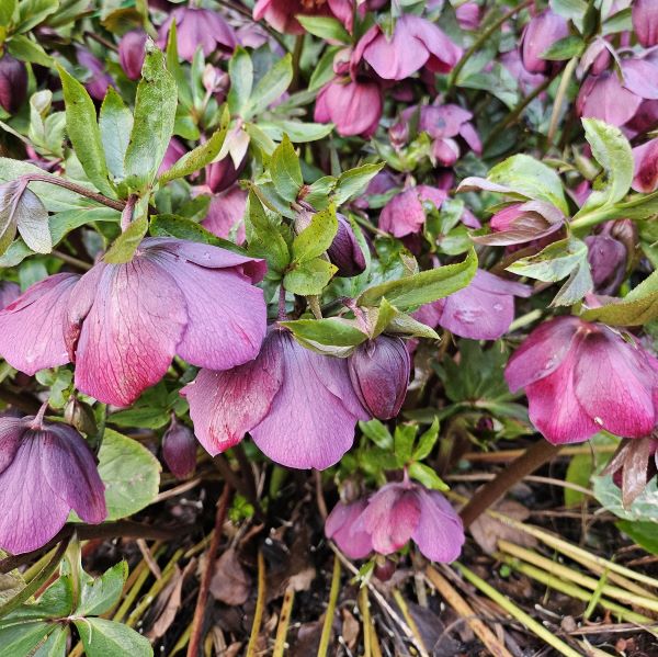 One last thing to share: hellebore plants in the front yard. The photo on the left was taken after today’s walk and the other from a couple weeks ago is the more common representation of these plants which like to hide their faces which mean’s today’s sighting is a gift, and that visibility is due to the fence’s support. All hail the hog wire!