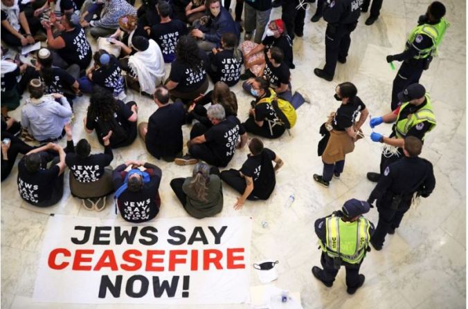 On October 18, 2023, protesters with the anti-Zionist organization Jewish Voice for Peace and other progressive Jewish groups staged a sit-in in the Cannon House Office Building at the U.S. Capitol in Washington, D.C., to protest the Israeli assault on Gaza.