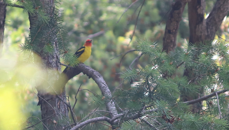 Guess what happened a couple minutes after my primary colors plea? A bird flew overhead and into a tree right in front of us. Without any muss or fuss, Zippy and I identified a Western Tanager which looks like this: