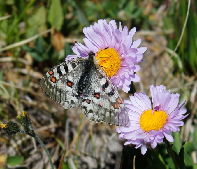 What is it? An alpine aster, but I only know this because of the other flowers in the frame. This, though, was my favorite representation. The curled petals remind me of those rolled-up paper noisemakers that unfurl and then roll up again.