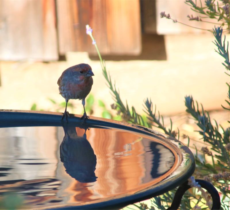 First up, is a House Finch that immediately flew to the bath right after I’d cleaned and filled it this morning: