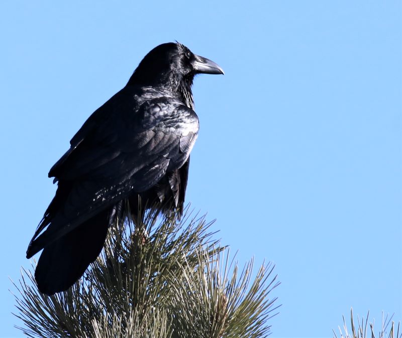 Then yesterday morning, we were in our front yard when a flock of crows flew past. But that wasn’t all. Moments later, this raven perched in the tree across the street for several minutes, making its croaking sound.