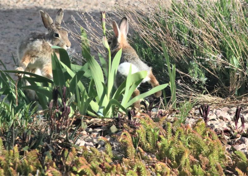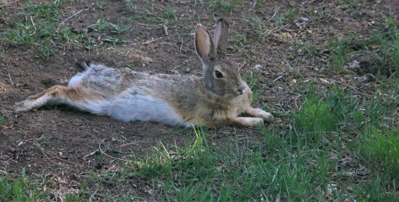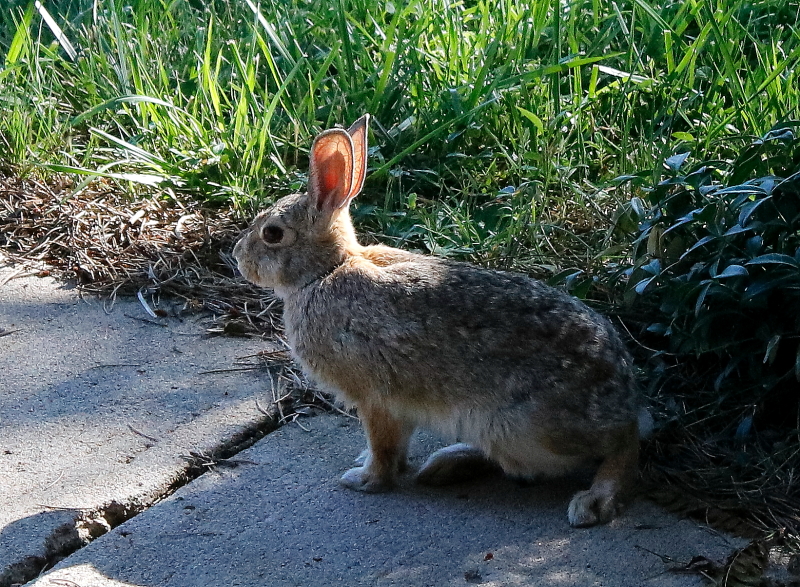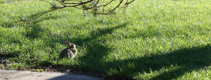 Silly bunny. Why go into a space where a dog frequently roams? And why leave the grassy front for the mulch-covered back? And while we’re at it, do you rabbits really believe flattening your ears against your head makes you invisible?