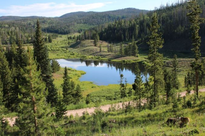 On my first morning there, I suited up to run on the Raccoon Trail which is a 3.5 mile loop (including spur from campground) that includes Panorama Point and a view of the Continental Divide. Because I was starting at 9100 feet elevation and would gain several hundred feet more, I knew water was essential. And while I never run with my phone, I knew it would be wise to have it, so wore my small hiking pack that holds a camel back for water. After some stretches to warm up, I took off. The pack bouncing on my back didn’t bother me, but I was very aware of the water as it sloshed with every step. The trail starts out in forest and soon opens up to aspen groves. Five minutes into the run, I sloshed my way around a curve and was startled by a large crashing in the brush. A moose! Heart hammering, I immediately stopped and spoke quietly while glancing around for a calf. I only saw the one moose, but my heart still pounded at the sight of all those skinny aspen trees that weren’t big enough to hide behind if the moose decided to charge. Fortunately, we both calmed down and it soon went back to browsing. As it moved farther from the trail, I slowly and silently (no sloshing!) continued on my way. A few minutes later I came upon a hiker and as she stepped off the trail to let me pass, she asked if I’d seen the moose. I said I had.
