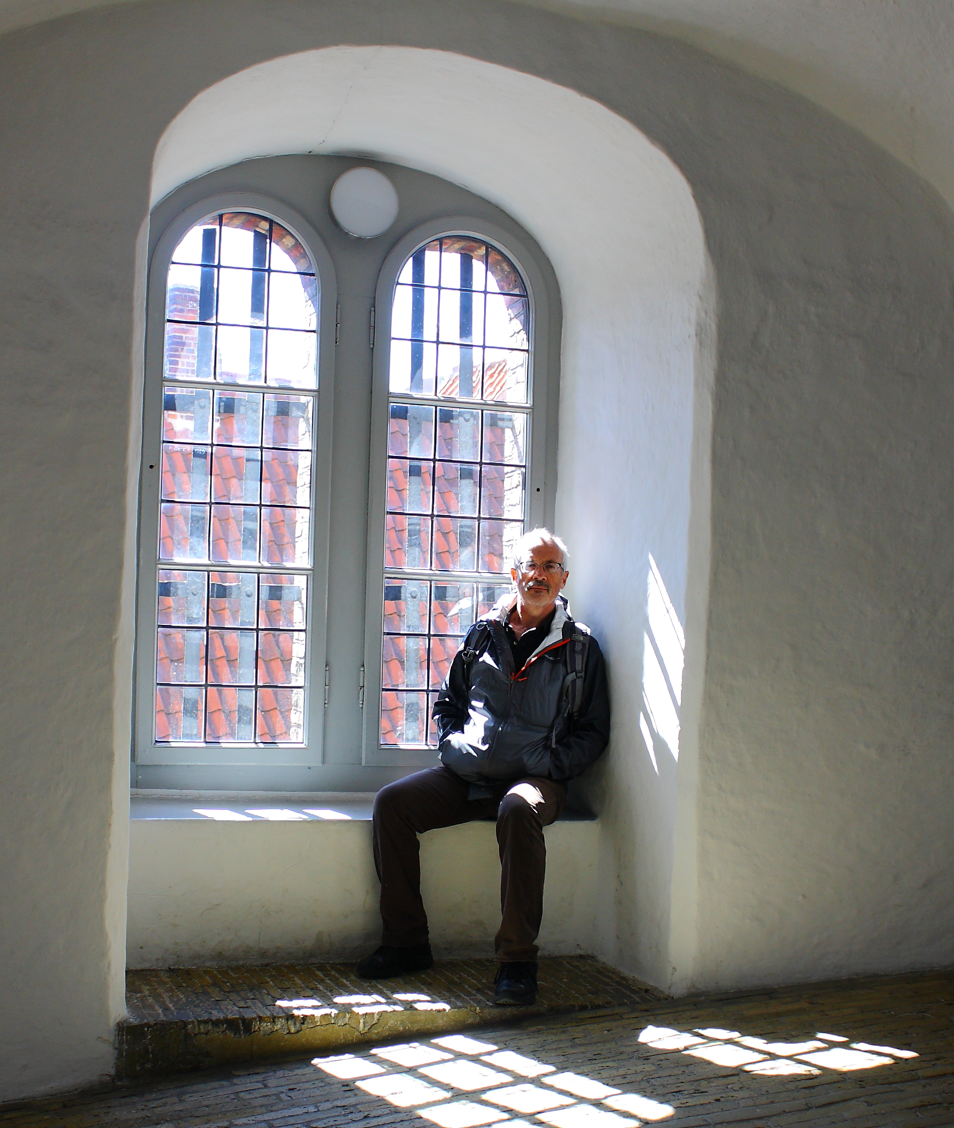 We went to the Trinitatis Church. By “went,” I mean peeked in long enough to take a photo which, because I’m exhausted, I’m having trouble editing, and then climbed to the round tower. Along the way, I found this fellow in a window seat: