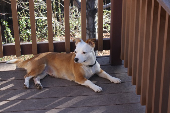 When we got off the trail and back on the street, we’d gone about 2.75 miles and Emma’s tongue was hanging out. We walked about 150 yards and then hit a patch of shade. She flopped onto her belly, legs splayed behind her, and panted. I let her stay down there while I stretched, and then got her going again. Several patches of shade later, she did the same thing. Belly flopped.