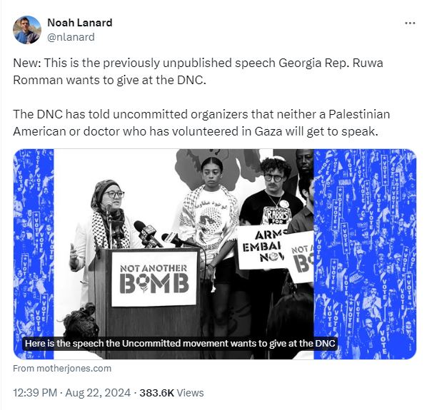 Journalist Noah Lanard just published a piece in Mother Jones, outlining how the Democratic National Convention has refused to allow any Palestinian to address the convention. This despite the “…thirty uncommitted delegates at the DNC representing the hundreds of thousands who voted uncommitted in lieu of supporting President Joe Biden’s primary campaign. They have been calling for a ceasefire and a halt to arms transfers to Israel while in Chicago.”