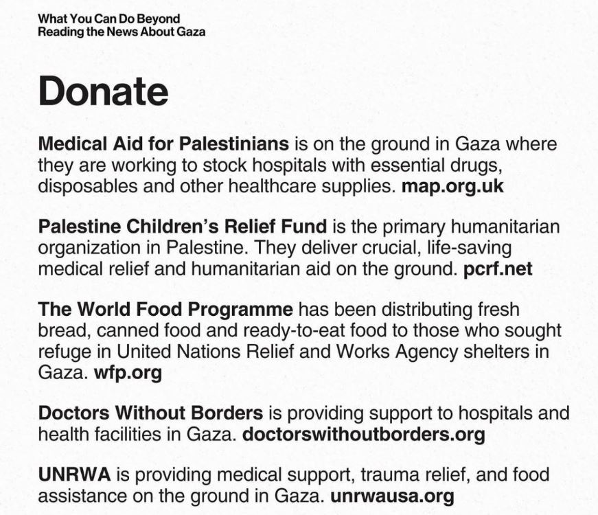 - Donate to UNRWA, GazaSunbirds, Doctors Without Borders, World Central Kitchen