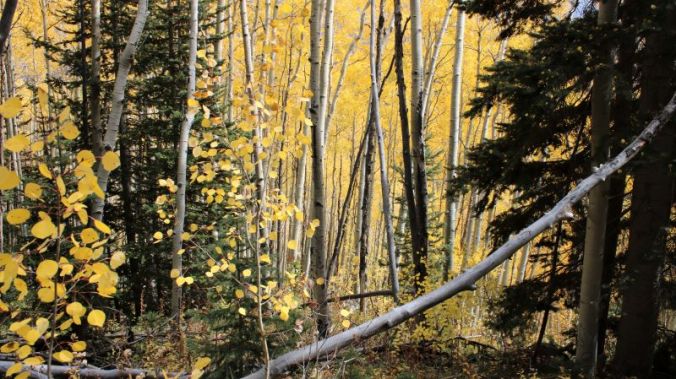 It wasn’t all pines, we did see some glorious aspen displays. Here we are taking turns being leaf-peepers. As you can see, Zippy’s approach is a bit more stealth than mine.