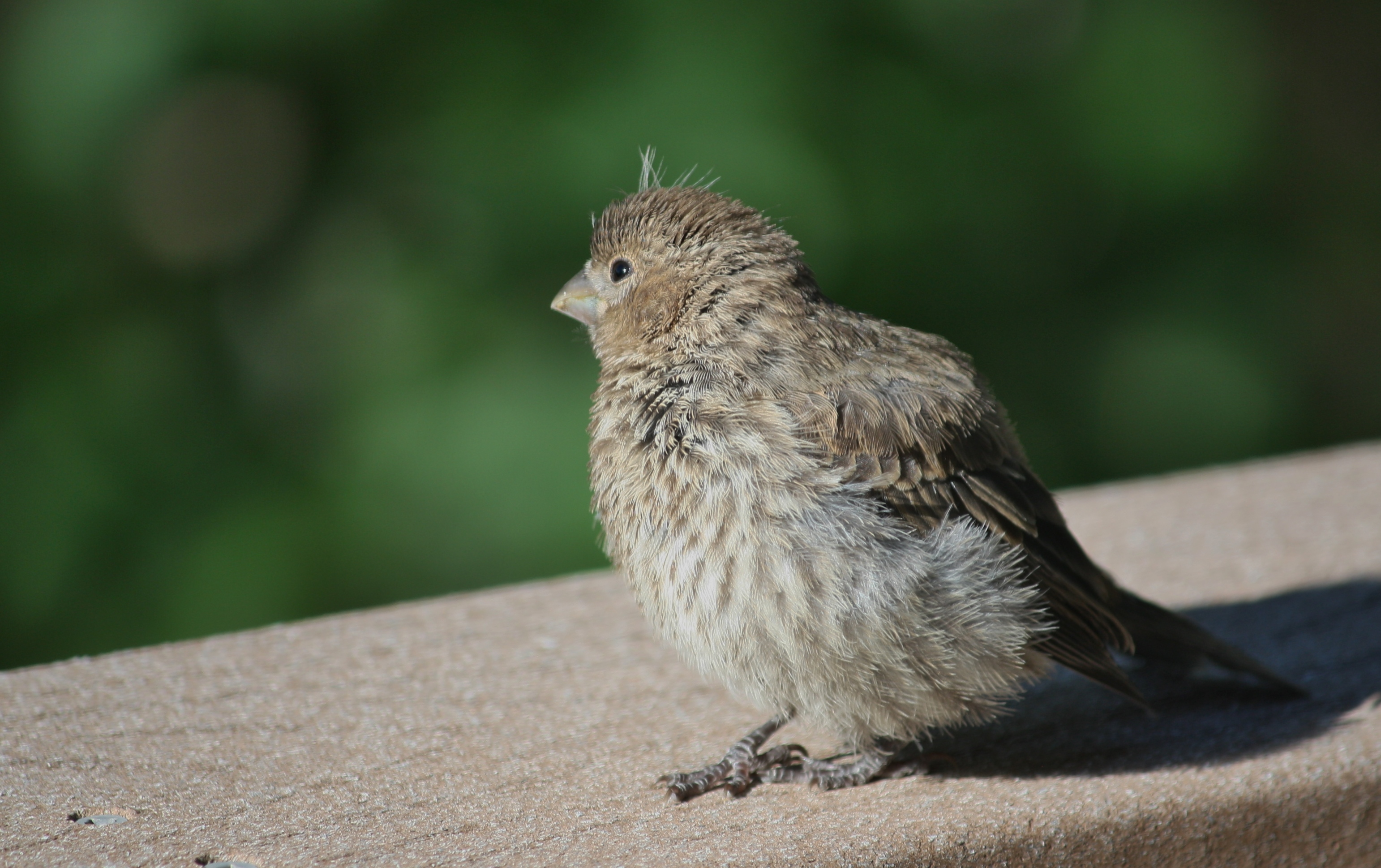 Discovered a finch on the deck rail this morning. Eyes closed. Visible, rhythmic breathing and tufted feathers on her head. I guessed she’d hit a window and was recovering from the trauma. As I watched, she opened her eyes and tilted her head before hopping to the edge of the rail. But she didn’t take off. A few moments later, a male finch landed on the rail and hopped closer in order to give her a safflower seed from the feeder.