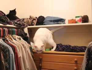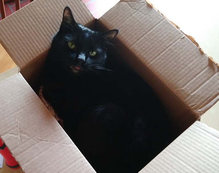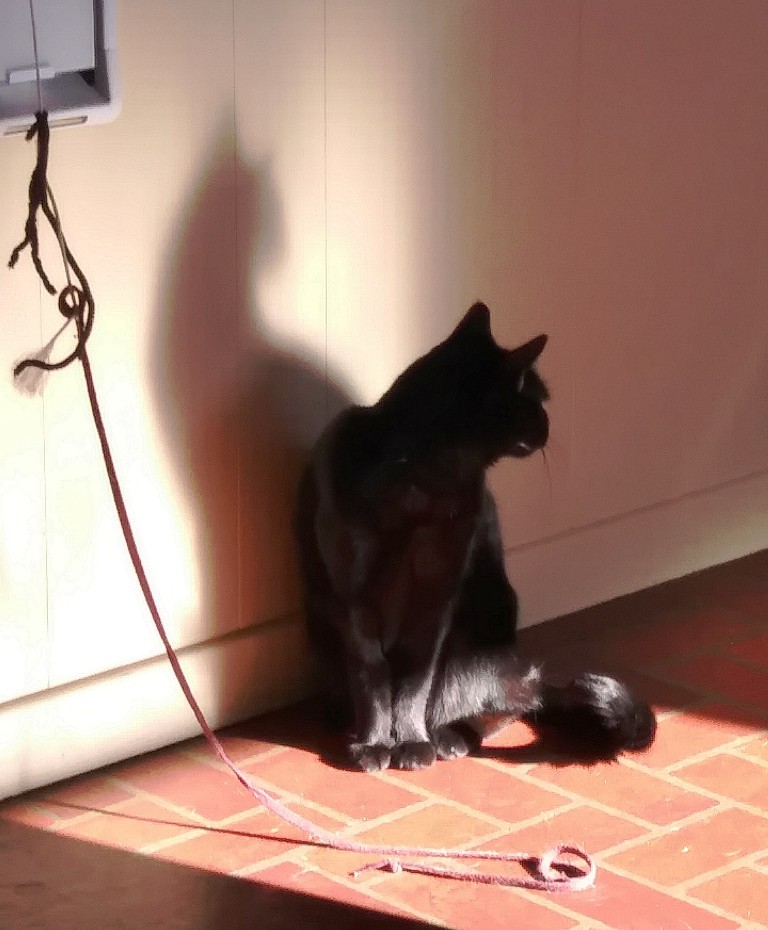 studies insects from a respectful distance, who was the aggressor. We tried hard to keep the peace between them, but multiple times over the past week Loki cornered and then chased her. Each time after it happened, Little Miss quivered in fear. Last night, Loki snuck up to where Little Miss was snuggled in Wildebeest’s lap and smacked her hard with his paw. I heard the frightened yelp from the basement. By that point, all the humans in the house were fed up with Loki’s bullying behavior. We were on #TeamLittleMiss and wondering what in the hell was wrong with the cat.