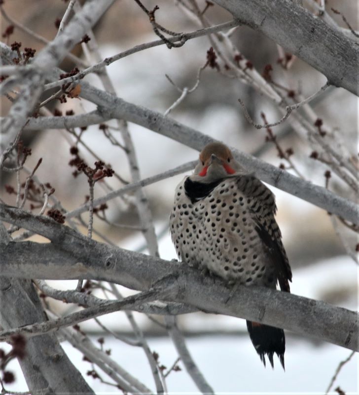 It’s cold, gray, and snowing right now. Ten days ago, it was cold, gray, and snowing when this Northern Flicker posed on the wire.