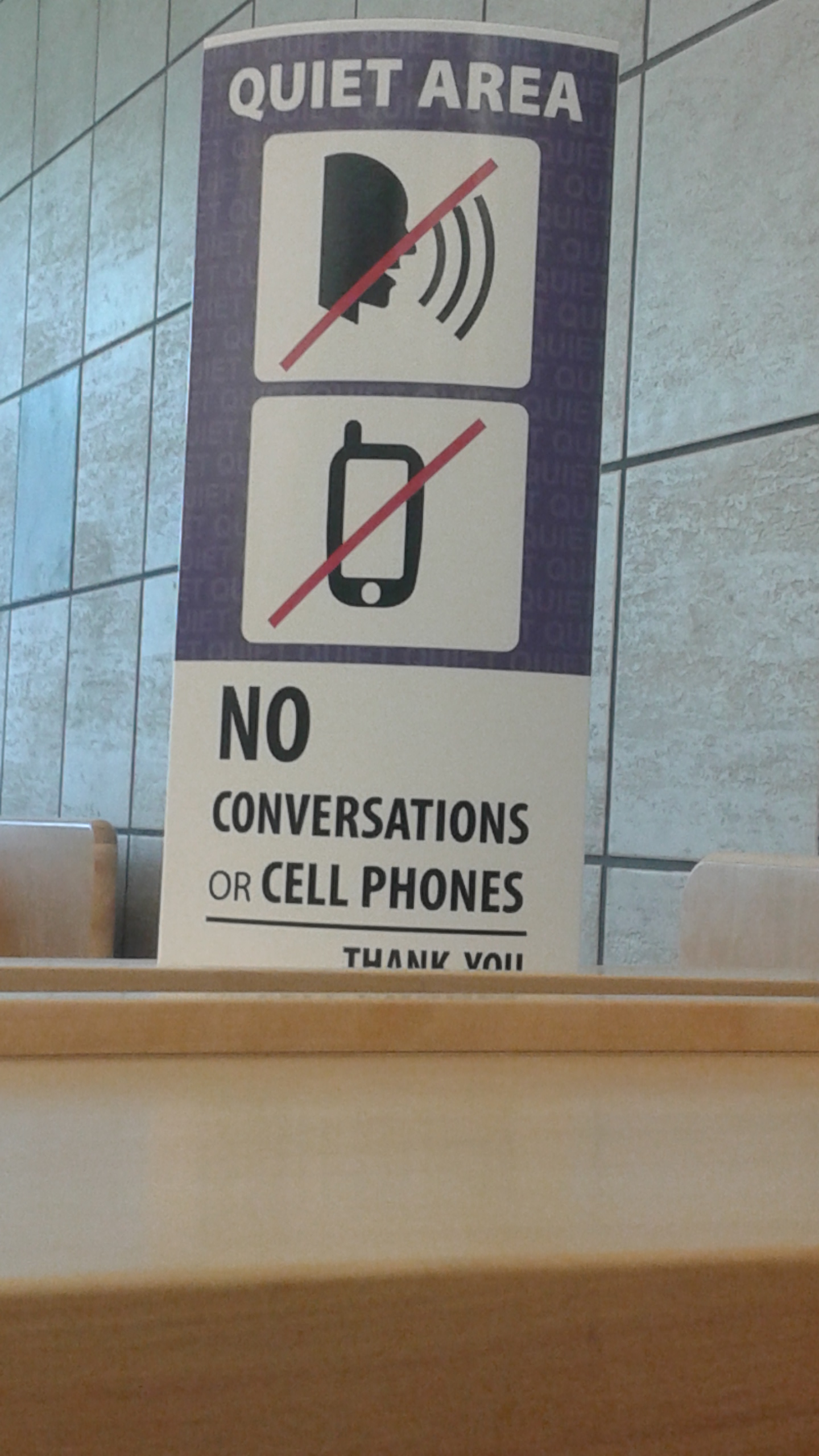 I’m at the library again, doing my best impression of The Little Engine that Could. My study carrel is in the quiet section that is liberally decorated with these signs: