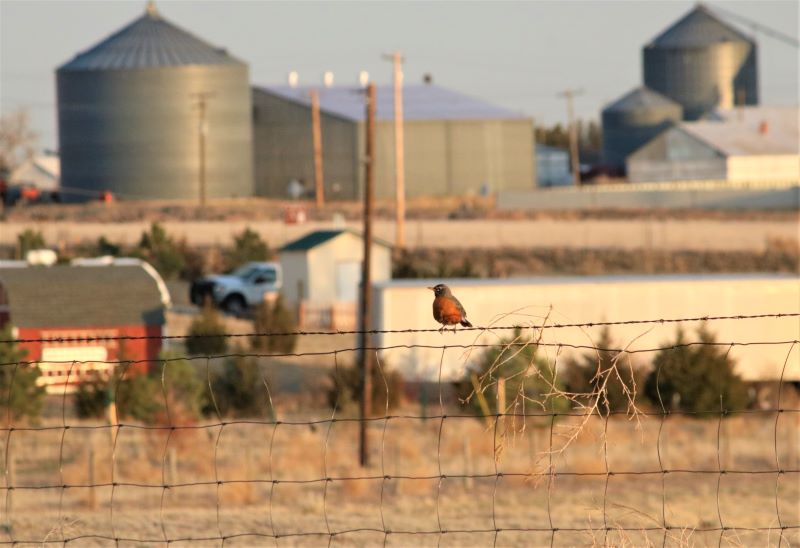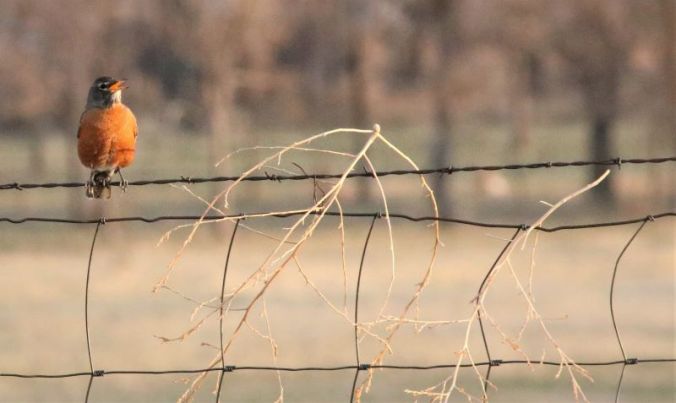 And here’s an American Robin singing as it perches on the fence next to a couple of the MANY tumbleweeds in the area (which I either leapt over or plowed through when running on the trails the next morning):