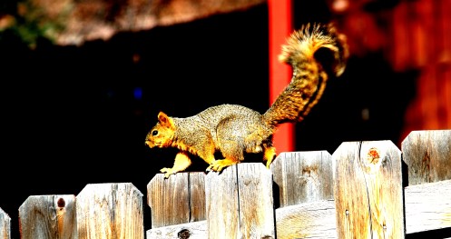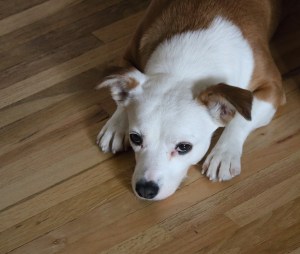 I was making another round of the back yard when I heard something. I stopped and listened. I heard it again and followed the sound. There was Marcel, curled up in a corner of the neighbor’s yard, crying and frozen in fear. Zippy climbed over the fence and brought him home.