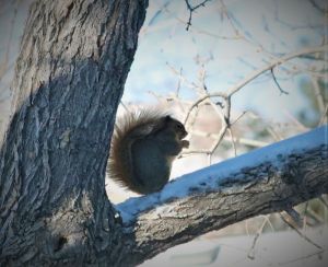 That little fist is a result of me tapping on the window to stop it from eating the peanuts we put out for birds* and, for the longest time, I thought it was the same brazen squirrel making a fist at me in response to my tapping. But then I realized it couldn’t be the same squirrel every single day and that ALL squirrels do that. Their immediate reaction to threat is a fist.
