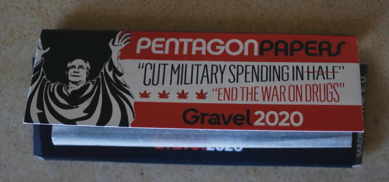 A packet of Pentagon rolling papers from presidential candidate Mike Gravel. Mike Gravel, former U.S. senator from Alaska, is running for president (and last month his campaign offered these papers in exchange for a donation). These papers are meaningful because while a Senator in 1971, Mike read a portion of the Pentagon Papers into the Congressional record. He believed the public had the right to know the truth behind the Vietnam War.