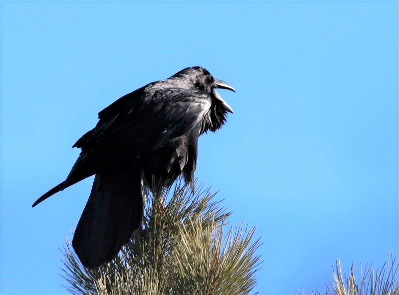 Then yesterday morning, we were in our front yard when a flock of crows flew past. But that wasn’t all. Moments later, this raven perched in the tree across the street for several minutes, making its croaking sound.