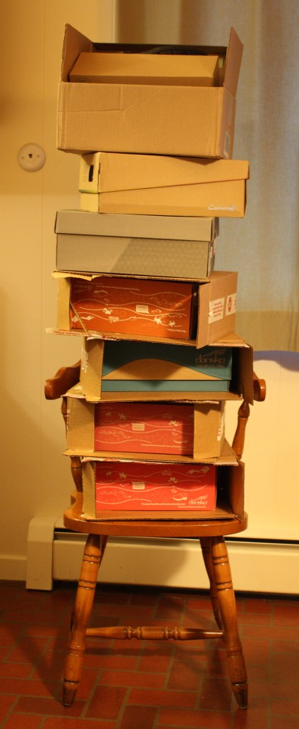 Okay, I’m exaggerating. Imelda Marcos was/is WAY more obsessed with shoes. However, I’ve got a shoe tower growing in my dining room.