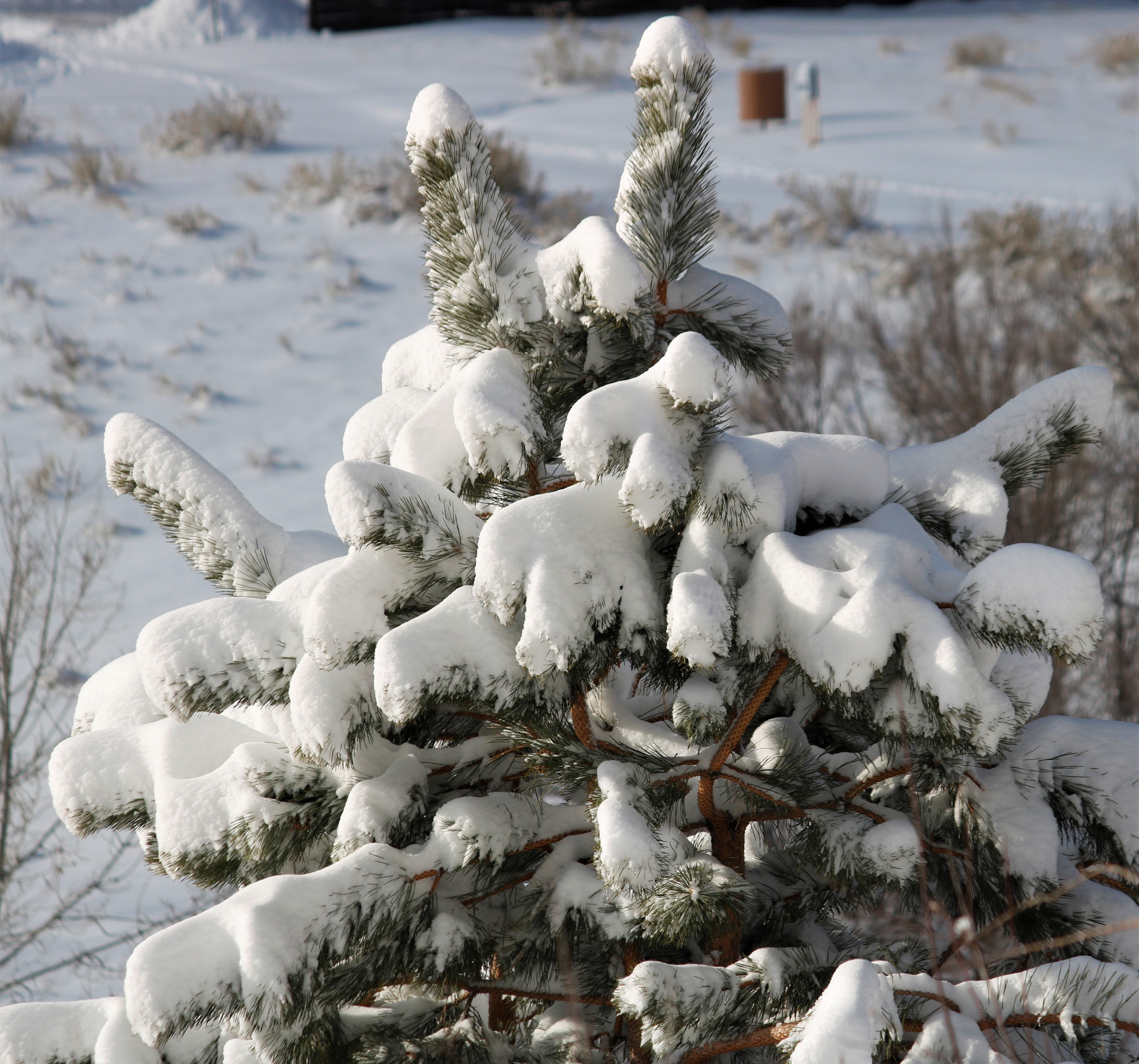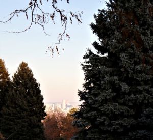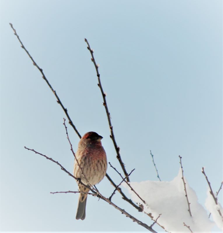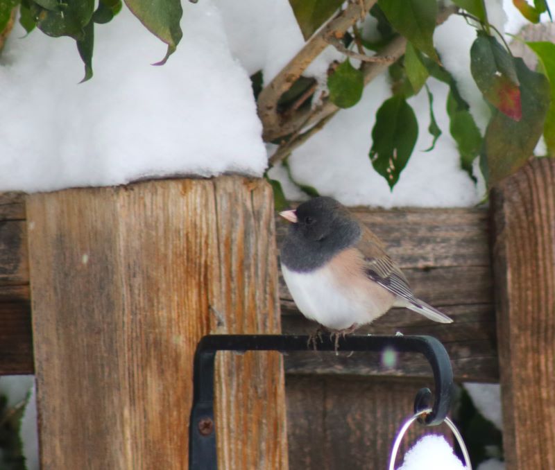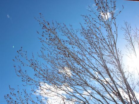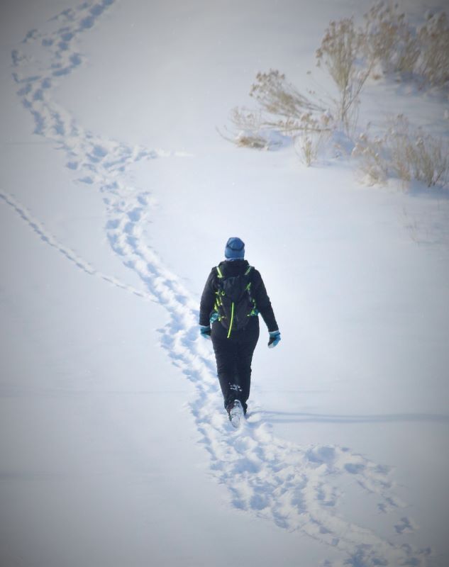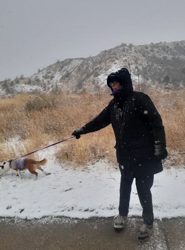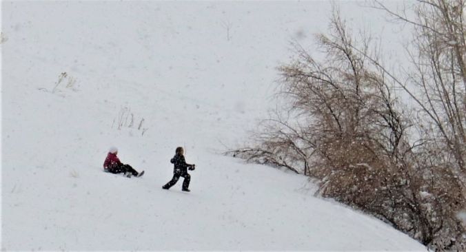 Despite waking up a bit stiff and tired from all the shoveling, I couldn’t resist the lure of the open space. Late this morning, I gathered my snowshoes and poles, and walked up to the trailhead. After strapping on the snowshoes, I veered off the path where others had already walked, thinking I wanted my own adventure. Um, no. The deep snow made each step a major chore and I knew I’d be exhausted within minutes. I instead followed others’ footprints, huffing and puffing as I gained elevation beneath the blue-blue-blue sky. I did my best to ignore the nasty brown cloud hovering above Denver and the surrounding area. Instead, I smiled at the yucca spines sticking up from the snow, marveled at the really deep drifts, and listened to chickadees and juncos. There were deer tracks and ski tracks, and I saw one person carrying a snowboard. Up on the ridgeline, a group of younger people were sledding down the hill.
