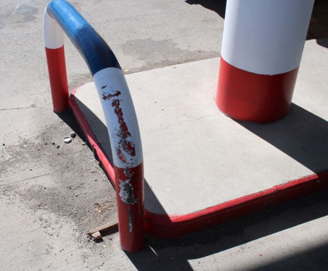 While I remained frozen in the driver’s seat, awash in a sea of excruciating déjà vu, Zippy got out to assess. He quickly reported that I’d somehow hit this guardrail so that Moby’s left rear tire was pushed against it, leaving no room to move forward.