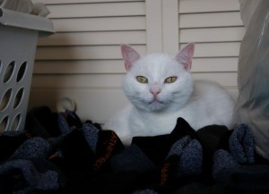 It took mere minutes for Marcel to discover the warm laundry just removed from the dryer. And when I went back down with my camera to document his trespass (which will result in white hairs all over my sons’ new dark-colored sweatshirts and socks), Marcel didn’t budge, despite his aversion to cameras.